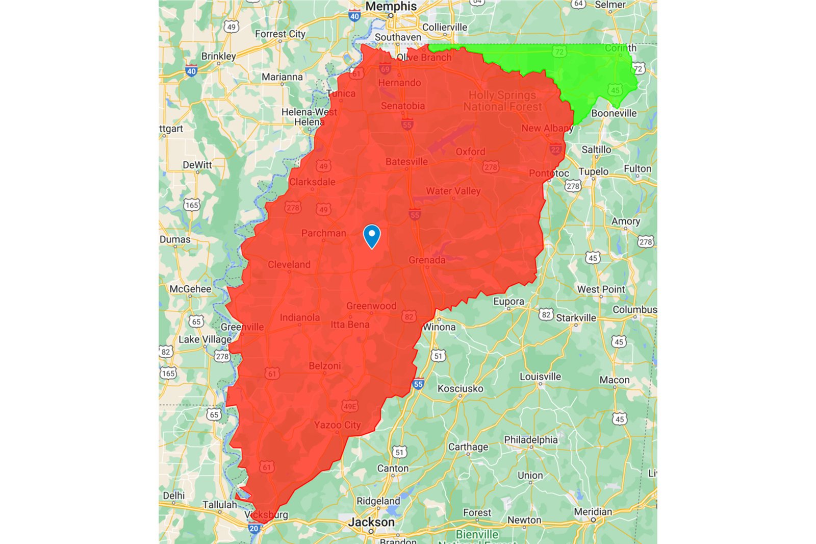 The Counties within the service area include: Desoto, Tunica, Marshall, Benton, Tippah, Alcorn, Prentiss, Union, Pontotoc, Calhoun, Lafayette, Panola, Coahoma, Quitman, Tallahatchie, Grenada, Tate, Bolivar, Sunflower, Carroll, Holmes, Yazoo, Sharkey, Is-saquena, Washington, Humphreys, Leflore, and parts of Chickasaw.